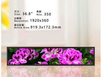 Product Label: Colour TFT LCD, cut bar screen, IPS LCD Application Product: cut bar screen Panel Type: a-Si TFT-LCD Product Composition: LCD module Panel Size: 36.8" Resolution: 1920×360 Aspect Ratio: >3:1 (W:H) Physical Shape: flat rectangle Display Size: 919.3 (W) × 172.3 (H) mm (A.A) Appearance Size: 950.7 (W) × 203.1 (H) mm Maximum Thickness: 55 mm LCD Family: IPS hard screen Polariser: transmissive Panel Brightness: 350 (Typ.) Transmissive Contrast Ratio: 4000:1 (Typ.) Display Colours: 16.7M Backlight Type: WLED Signal Type: LVDS Signal Pin Count: 51 Pins Touch Screen: no touch Operating Temperature: 0 ~ 50 °C Storage Temperature: -20 ~ 60 °C