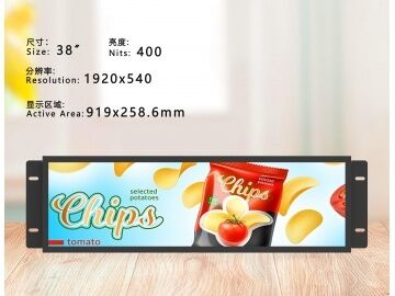 Product Label: Wall-mounted Advertising Machine Screen Quantity: Single Screen Panel Category: TFT-LCD Panel Size: 38" Aspect Ratio: >3:1 (W:H) Resolution: 1920×540 Display Brightness: 400 cd/m² Contrast Ratio: 1000:1 Display Colours: 16.7M Control Type: Standalone Power Type: External Power Rated Voltage: DC 24V Installation Method: Wall-mounted Installation Orientation: Horizontal Screen Operating Temperature: 0 ~ 50 °C Protection Rating: Front Shell:, Rear Shell: Operating Environment: Indoor Safety Certification: CCC (China).