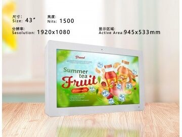 Product Label: Wall-mounted Advertising Machine Screen Quantity: Single Screen Panel Category: TFT-LCD Panel Subcategory: IPS TFT-LCD Panel Size: 43" Aspect Ratio: 16:9 (W:H) Resolution: 1920×1080 Display Brightness: 1500 cd/m² Display Colour: 1.07B Control Type: Standalone Power Type: Built-in Power Rated Voltage: AC 220V Installation Method: Wall-mounted Installation Orientation: Landscape Operating Temperature: -30 ~ 45 °C Protection Level: Front Cover:, Back Cover: Operating Environment: Indoor Safety Certification: CCC (China).![]()