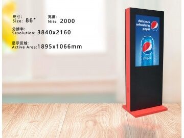 Product Label: Floor-standing Advertising Machine Screen Quantity: Single Screen Panel Type: TFT-LCD Panel Size: 86" Aspect Ratio: 16:9 (W:H) Resolution: 3840×2160 Display Brightness: 2000 cd/m² Display Colours: 1.07B Control Type: Standalone Power Type: Built-in Power Supply Rated Voltage: AC 220V Installation Method: Floor-standing Installation Orientation: Landscape Working Temperature: -30 ~ 45 °C Protection Level: Front Casing:, Rear Casing: Operating Environment: Indoor Safety Certification: CCC (China)![]()