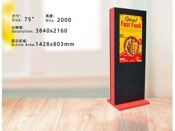 Product Label: Floor-standing Advertising Machine Screen Quantity: Single Screen Panel Type: TFT-LCD Panel Size: 75" Aspect Ratio: 16:9 (W:H) Display Brightness: 2000 cd/m² Display Colours: 1.07B Control Type: Standalone Power Type: Built-in Power Supply Rated Voltage: AC 220V Installation Method: Floor-standing Installation Orientation: Landscape Operating Temperature: -30 ~ 45 °C Protection Rating: Front Cover: , Back Cover: Operating Environment: Indoor Safety Certification: CCC (China)![]()