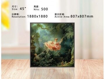 Product Label: Wall-mounted Advertising Machine Screen Quantity: Single Screen Panel Category: TFT-LCD Panel Subcategory: IPS TFT-LCD Panel Size: 45" Aspect Ratio: 1:1 (W:H) Resolution: 1880×1880 Display Brightness: 500 cd/m² Contrast Ratio: 1200:1 Display Colour: 1.07B Control Type: Standalone Power Type: Built-in Power Rated Voltage: AC 220V Installation Method: Wall-mounted Installation Orientation: Horizontal Screen Operating Temperature: 0 ~ 50 °C Protection Level: Front Cover:, Back Cover: Operating Environment: Indoor Safety Certification: CCC (China).