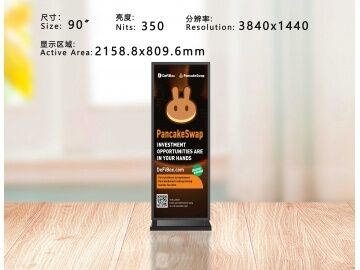 Product Label: Floor-standing Advertising Machine Screen Quantity: Single Screen Panel Type: TFT-LCD Panel Size: 90" Aspect Ratio: 8:3 (W:H) Resolution: 3840×1440 Display Brightness: 350 cd/m² Contrast Ratio: 1200:1 Display Colours: 1.07B Control Type: Standalone Version Power Type: Built-in Power Rated Voltage: AC 220V Installation Method: Floor-standing Installation Orientation: Horizontal Screen Operating Temperature: 0 ~ 55 °C Protection Level: Front Case:, Rear Case: Operating Environment: Indoor Safety Certification: CCC (China)